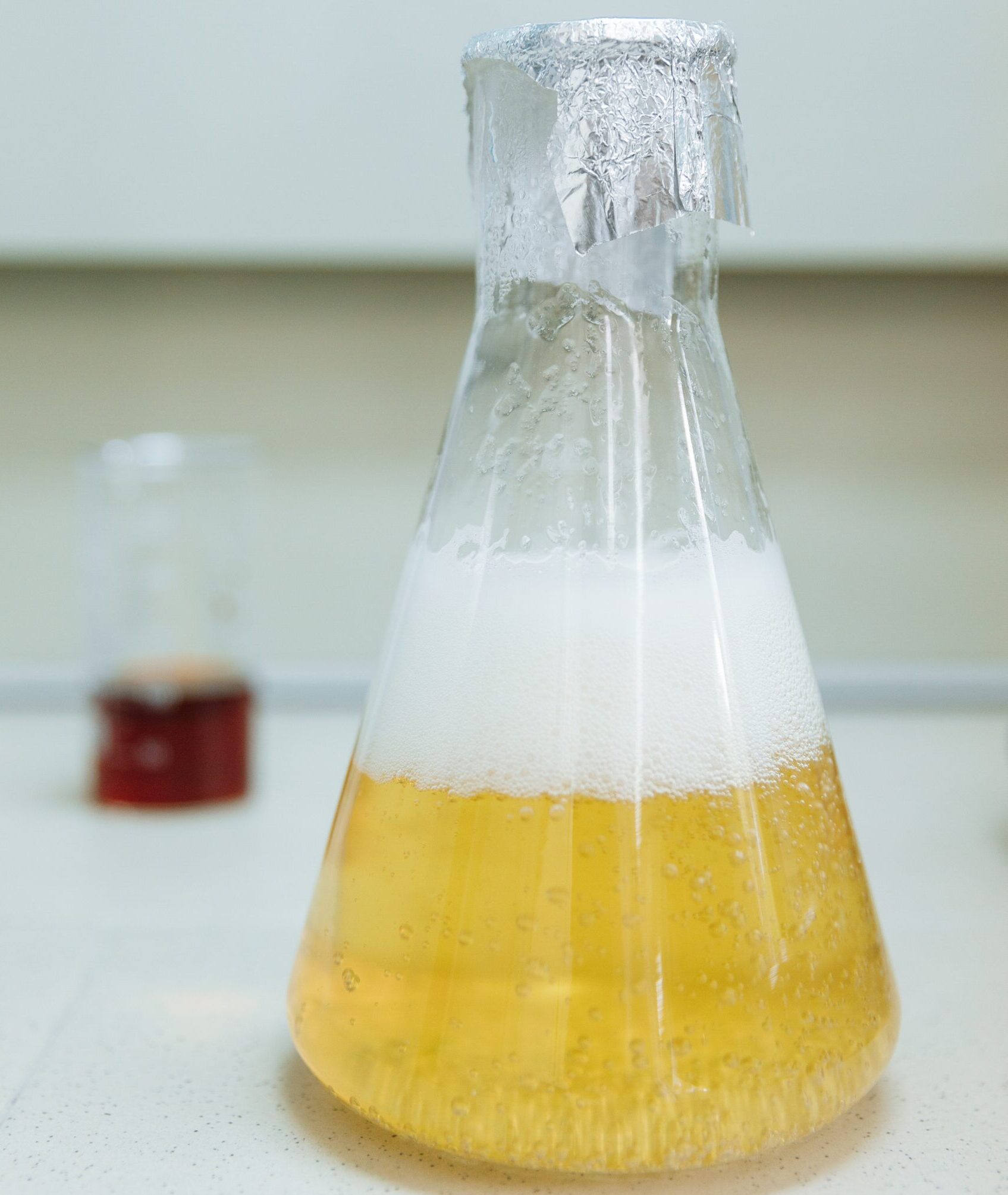 - Er ligt een mooi laagje witte gist op de bodem van de Erlenmeyer