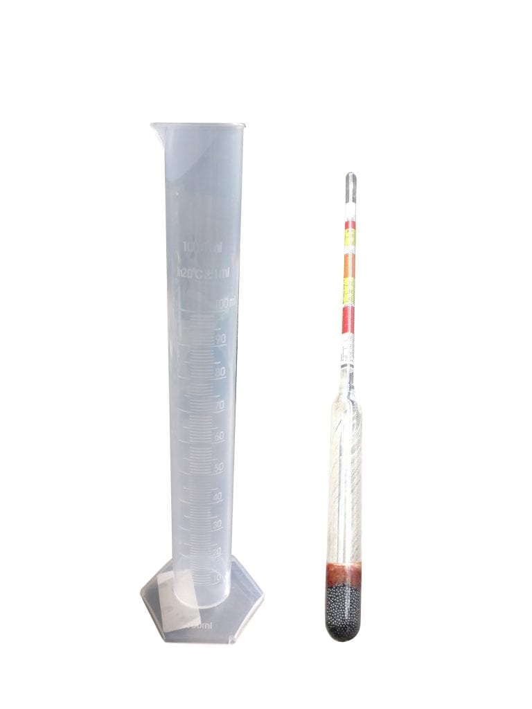 Een hydrometer wordt zowel voor als na het brouwproces gebruikt. Het maakt gebruik van de relatieve dichtheid van de vloeistoffen om het suikergehalte te berekenen. Bij een hydrometer gebruik je altijd ook nog een maatbeker om de hydrometer als een soort van dobber in te kunnen laten drijven.
