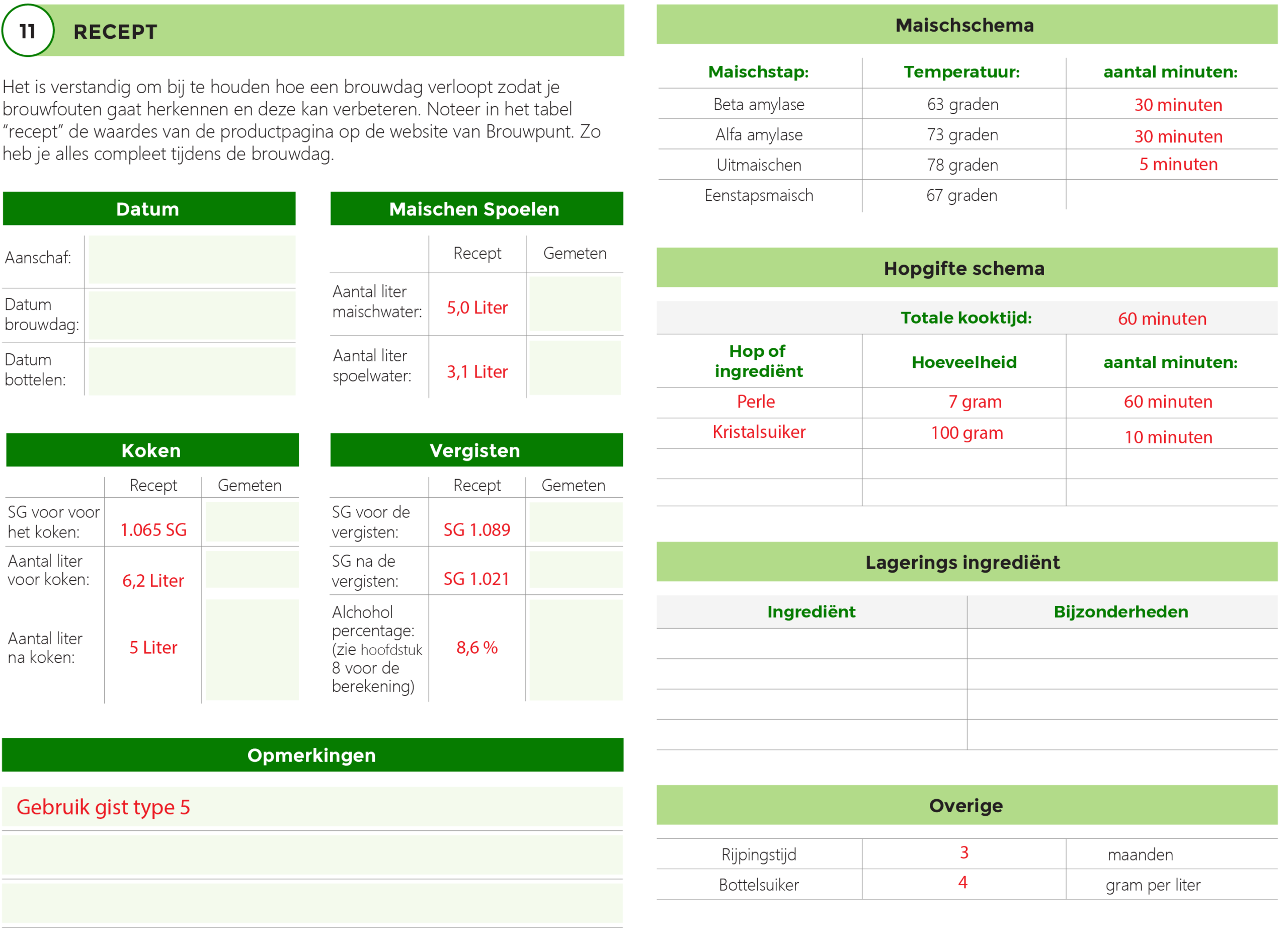 Bij je bierbrouw starterspakket krijg je een instructieboekje meegeleverd die voor alle bierstijlen te gebruiken is. Voor jouw recept heb je alleen op de brouwdag zelf een aantal unieke waardes nodig en die kan je vanuit onderstaande afbeelding overnemen in jouw boekje.