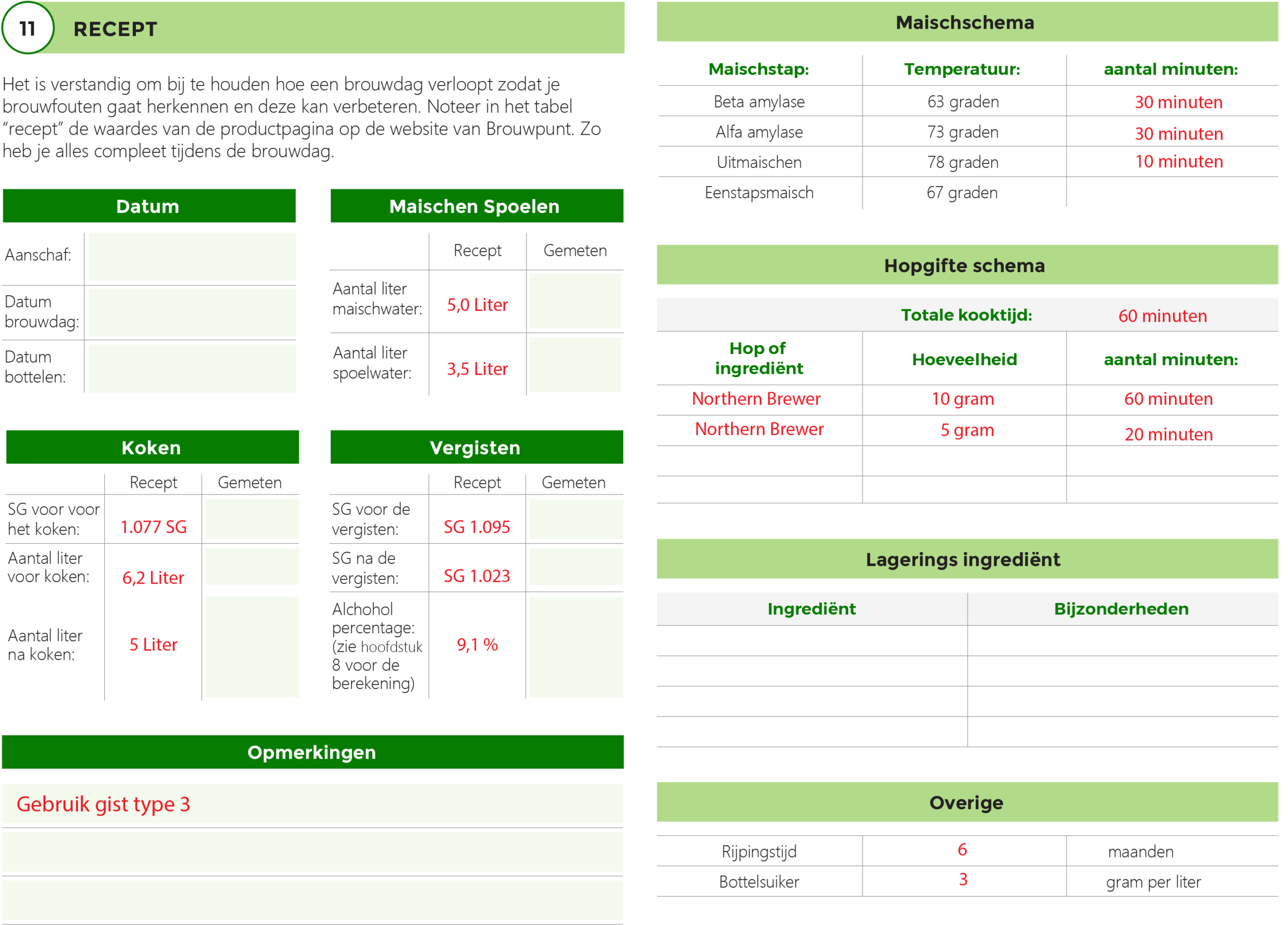 Bij je bierbrouw starterspakket krijg je een instructieboekje meegeleverd die voor alle bierstijlen te gebruiken is. Voor jouw recept heb je alleen op de brouwdag zelf een aantal unieke waardes nodig en die kan je vanuit onderstaande afbeelding overnemen in jouw boekje.